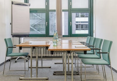 Zur Ausstattung gehören ein Beamer, schnelles WLAN, Whiteboard, Flipchart und Schreibunterlagen. Auf Wunsch können Sie gern weitere Konferenztechnik dazu buchen, lassen Sie sich einfach von unserem Team beraten.
